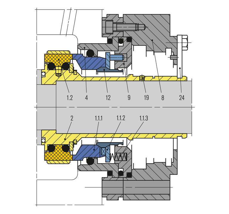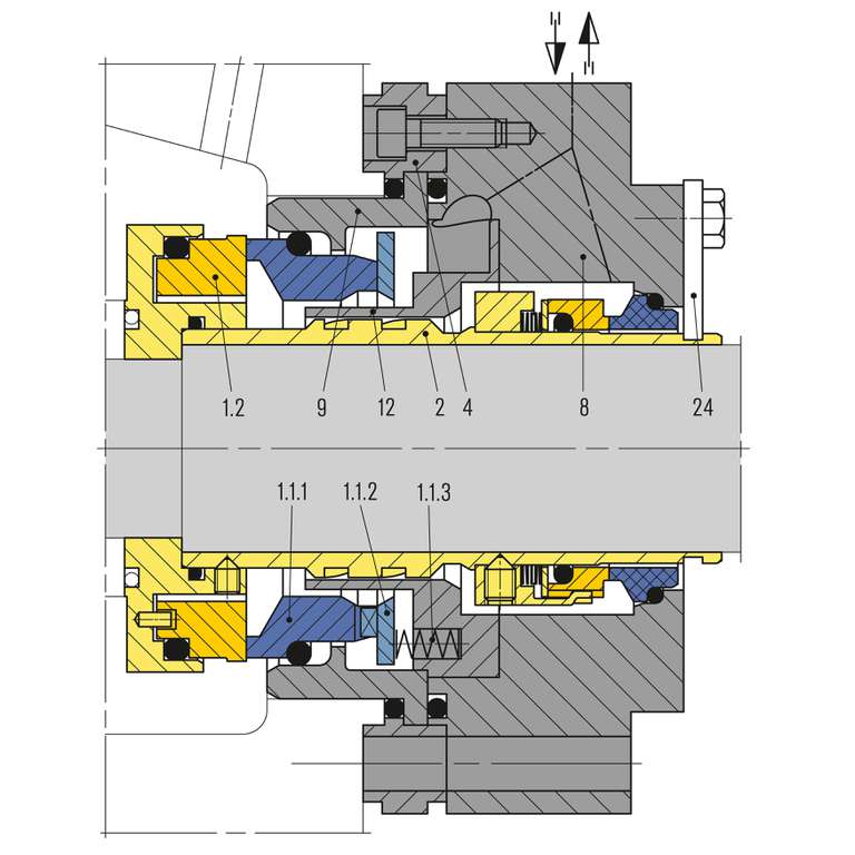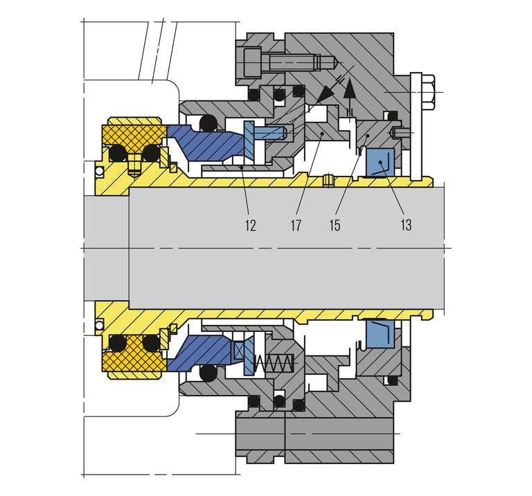 With uni-directonal pumping screw. Dual seal remains closed in case of barrier pressure failure and closes in the event of pressure reversal. With guide sleeve (item no. 12). Operation as single seal with quench possible. Encapsulated stationary seat on the product side (bursting protection). Parted seal sleeve for application of highly restistant materials e.g. Hastelloy®.